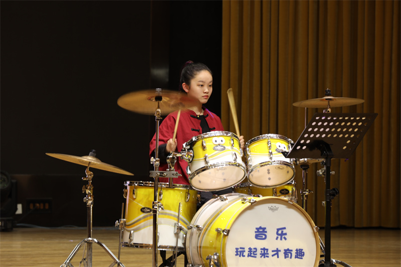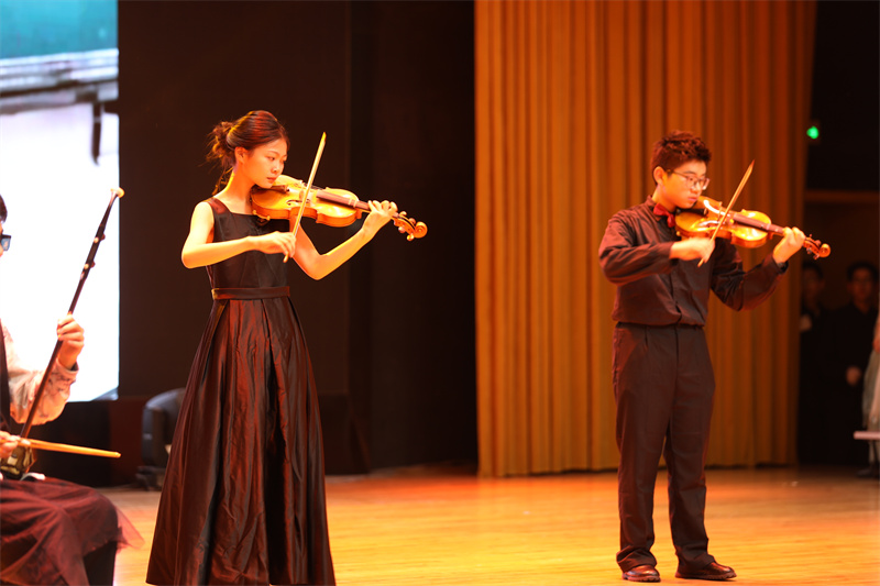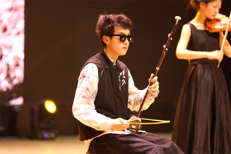 灯火初上,掌声未歇。器乐合奏《直到世界尽头》率先点燃全场热情。小提琴清越明亮,如春泉叮咚;架子鼓铿锵有力,似惊雷滚地;二胡悠远绵长,若山风低语。三种音色交织融合,中西乐器在舞台上完成了一场跨越时空的对话,亦刚亦柔,收放之间勾勒出盛春气象——既有繁花似锦的绚烂,也有奔涌向前的力量。
