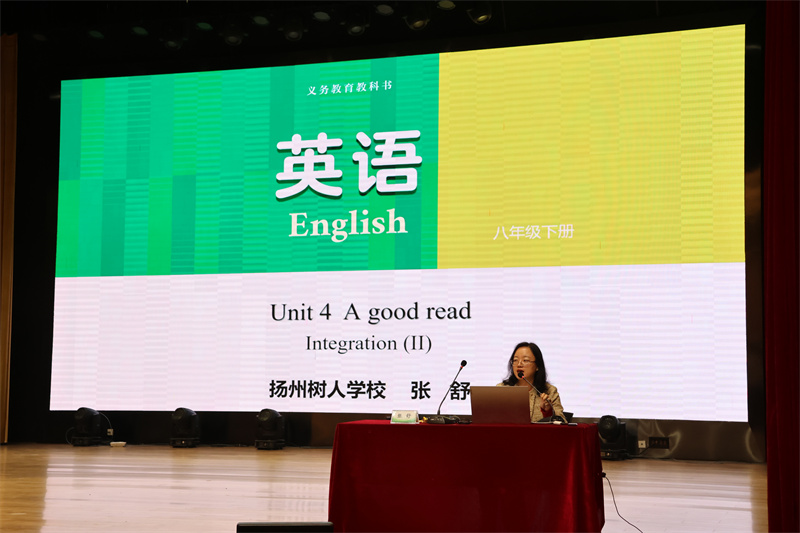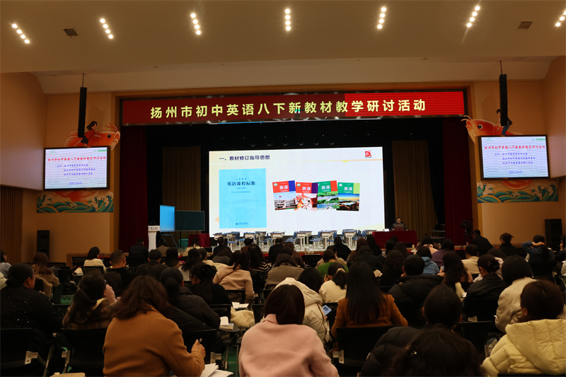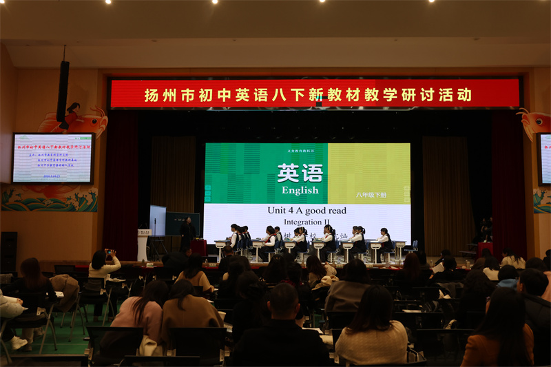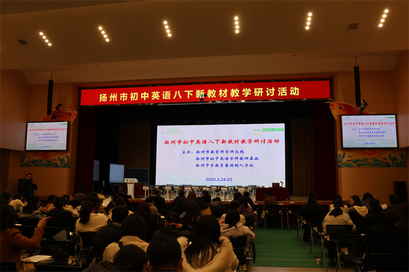 为深化全市初中英语学科建设,提升教师依标施教能力与课程实施质量,2026年3月24—25日,扬州市初中英语八年级下册新教材教学研讨活动在扬州中学教育集团树人学校南门街校区艺术报告厅顺利举行。扬州市各县市区初中英语教研员,七、八年级英语教师代表参与观摩。活动由扬州市直初中英语教研站站长、树人学校教务处兼教科室主任常松主持。