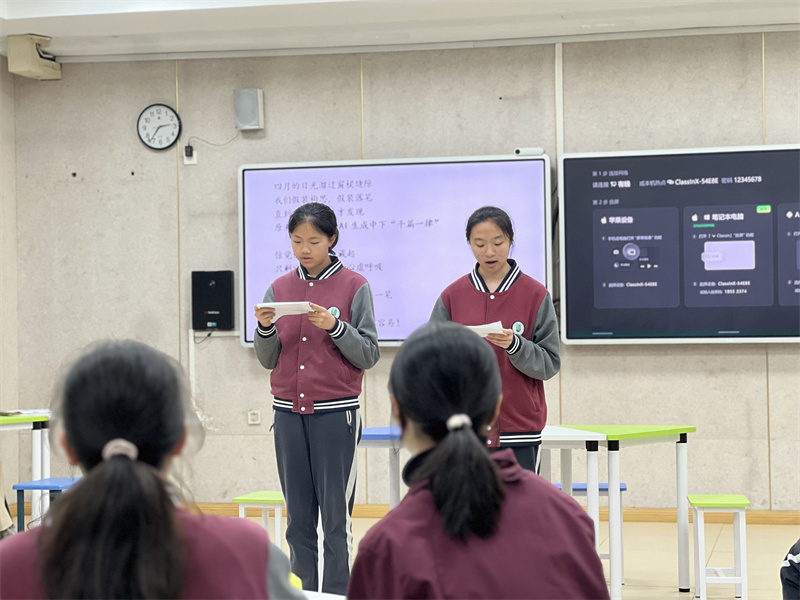 吴敏老师带领初三(10)班的孩子,在AI智能教室内举行了一场别开生面的综合性语文学习成果汇报活动。本次活动以“AI语文,是‘爱’还是‘碍’——学习是助力还是阻碍”为主题,全班同学以小组合作形式呈现了一场集朗诵、戏剧、演讲、辩论、新闻采编于一体的学习盛宴。