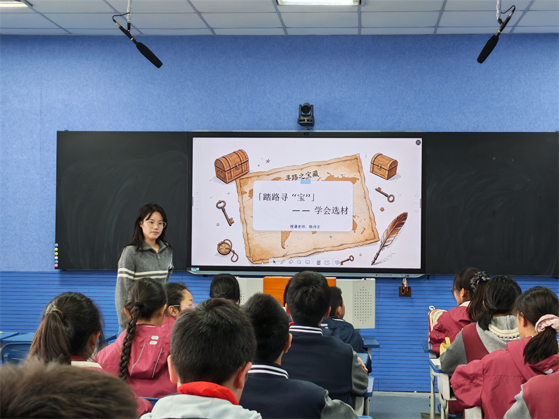 第二课时,陈诗雯老师为初一(12)班执教写作指导课《如何选材》。陈老师从学生写作的实际痛点出发,通过鲜活的生活案例和经典课文范例,层层递进地引导学生掌握“选材典型、取舍有度”的方法。课堂上,学生积极思考、动笔实践,在小组交流中碰撞出选材的火花,切实提升了写作素材的甄别与运用能力。
