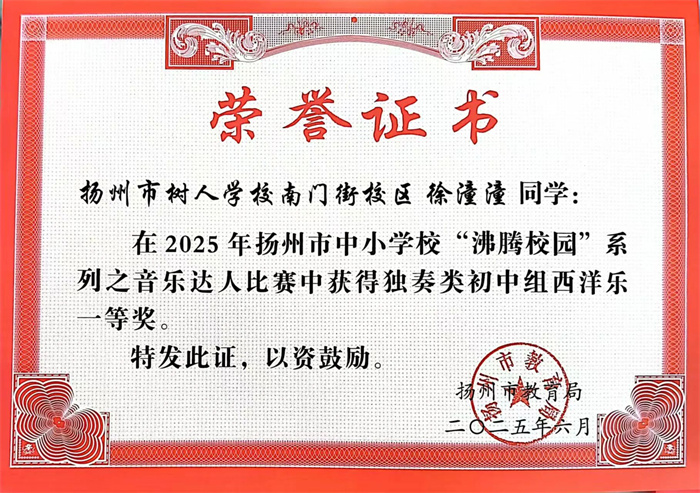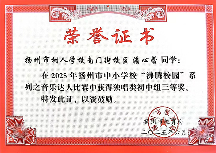 2025年扬州市中小学校“沸腾校园”系列之音乐达人比赛结果近日揭晓。树人学校积极组织学生参与,经过校级和市直两级选拔,最终初中部有三名优秀学生代表参加市赛。南门街校区徐潼潼同学、潘心蕾同学在比赛中表现出卓越的艺术素养与舞台风采,成功斩获奖项,充分展现了树人学校艺术教育的扎实功底与丰硕成果。