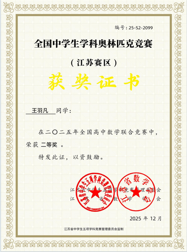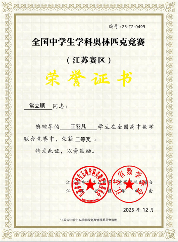2025年全国中学生数学奥林匹克竞赛(江苏省赛区)中传来捷报,我校周宇晨、王羽凡两位同学取得佳绩,获得省二等奖!此次大赛中,张红艺和常立顺两位老师荣获省级优秀指导教师称号。