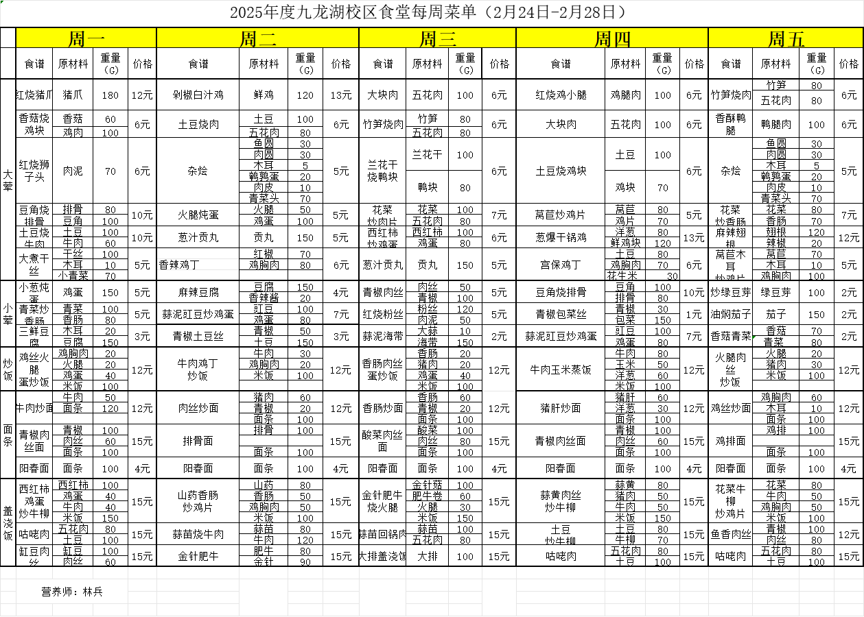 九龙湖校区2024——2025学年下学期第2周学生菜谱
