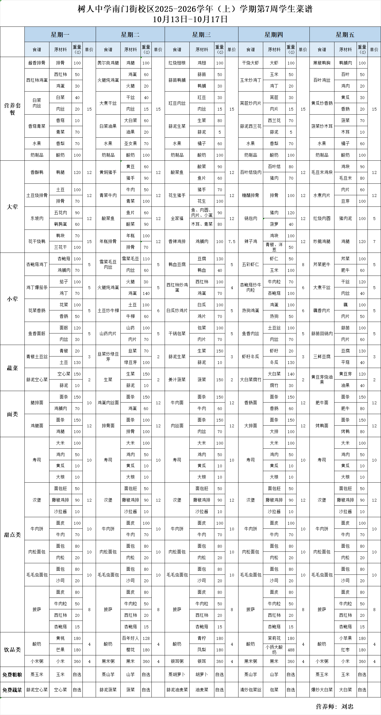 南门街校区2025——2026学年上学期第7周学生菜谱