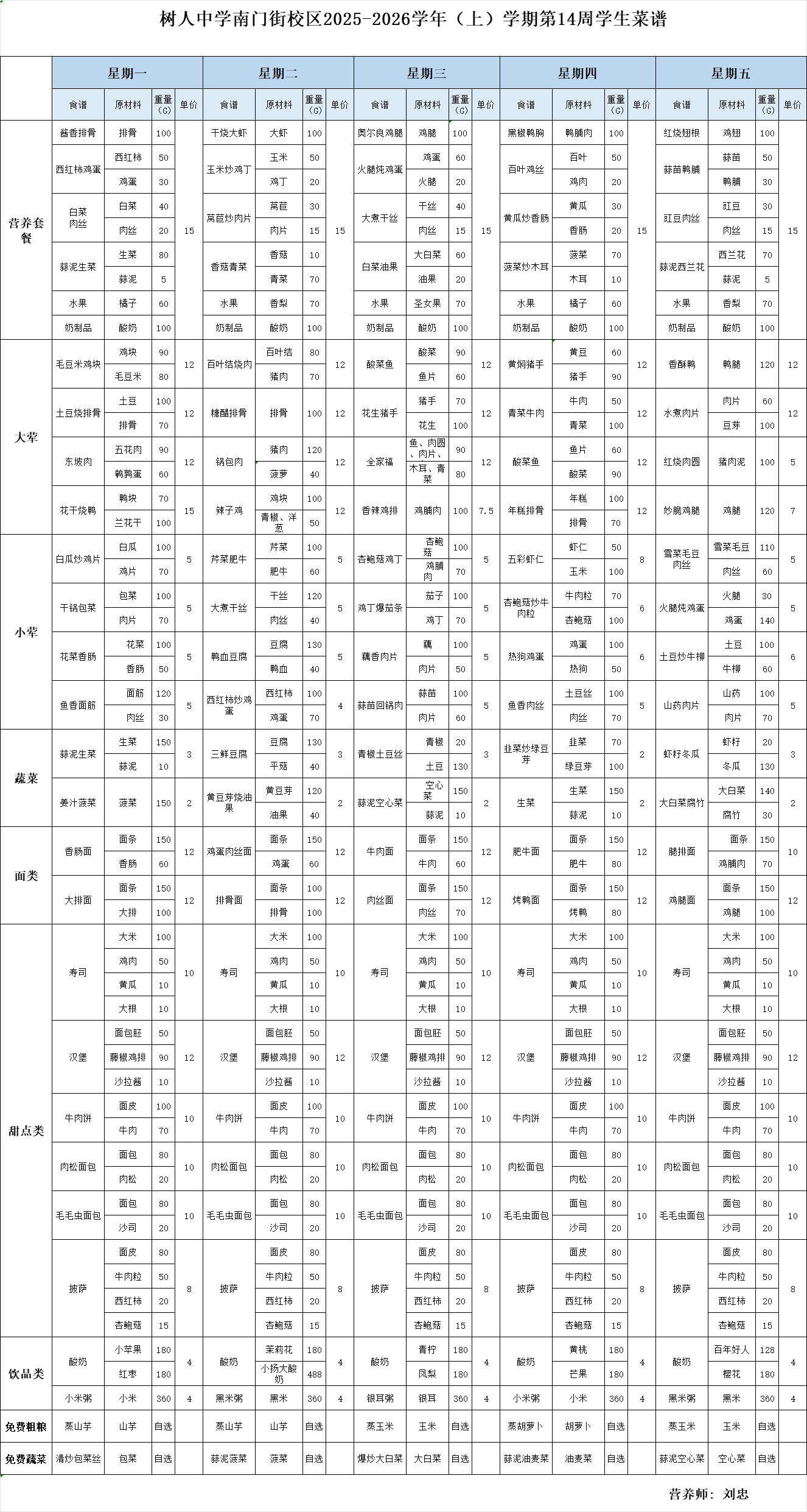 南门街校区2025——2026学年上学期第14周学生菜谱