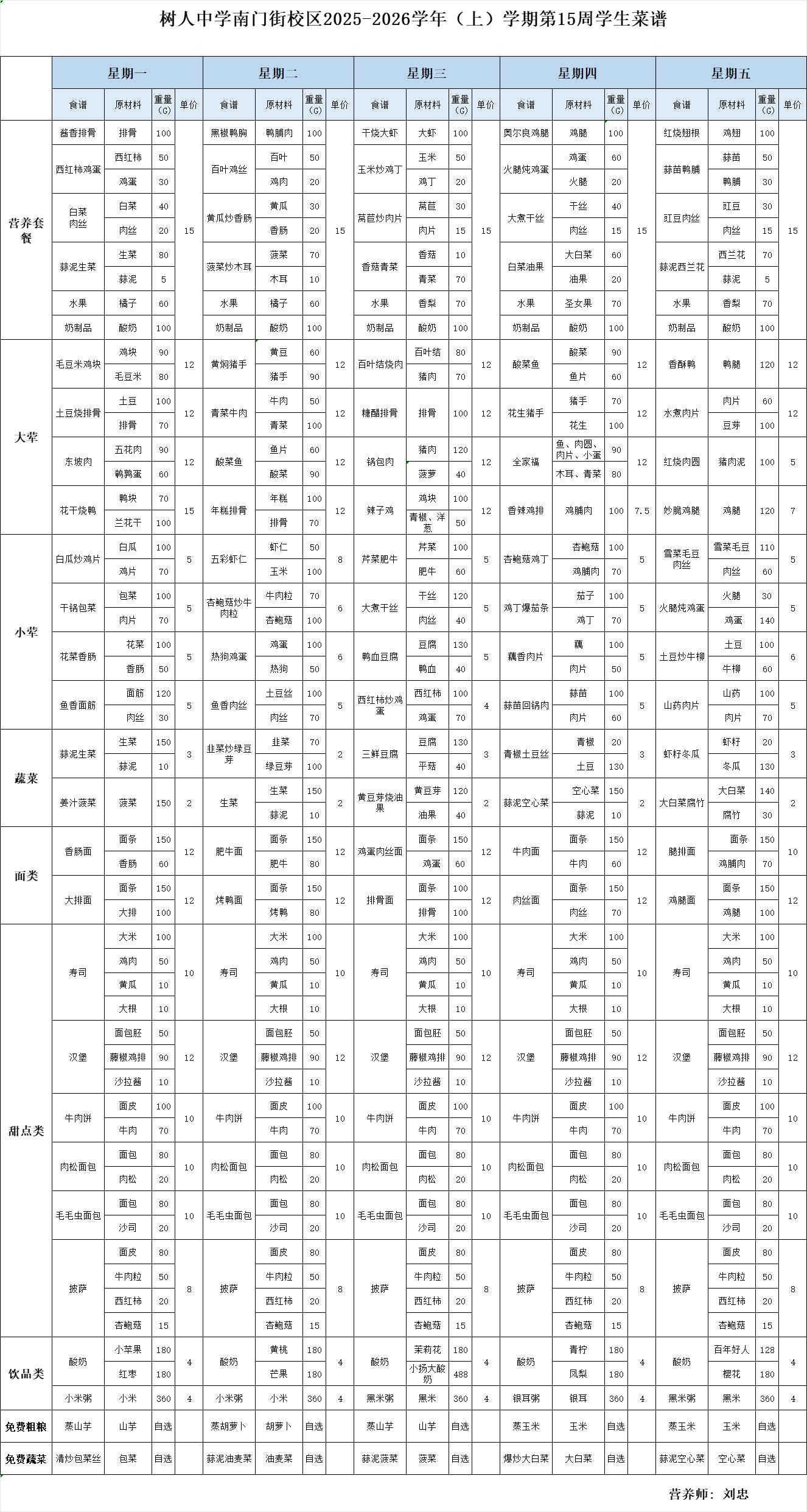 南门街校区2025——2026学年上学期第15周学生菜谱