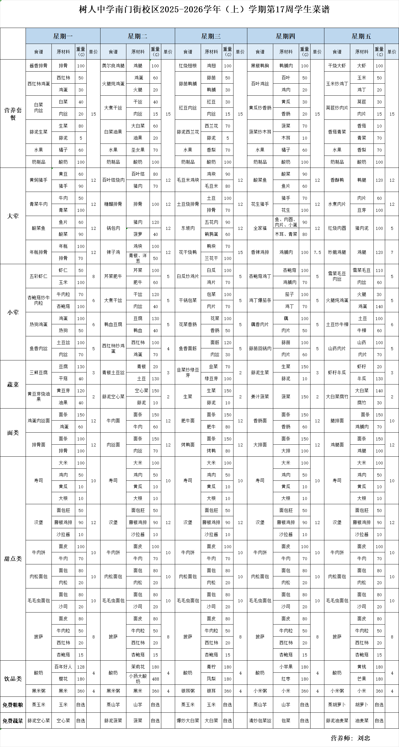 南门街校区2025——2026学年上学期第17周学生菜谱