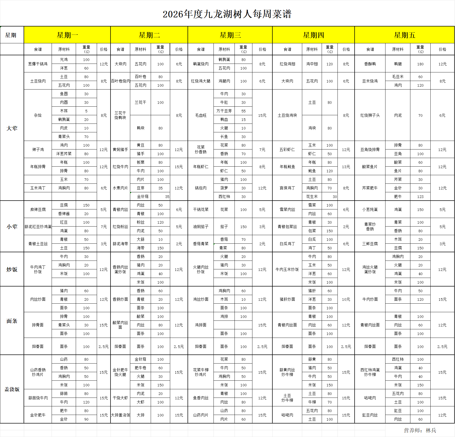 九龙湖校区2025——2026学年下学期第4周学生菜谱