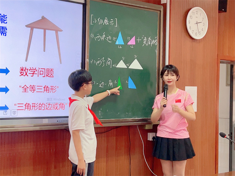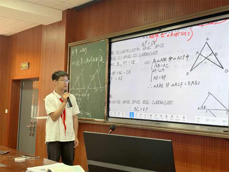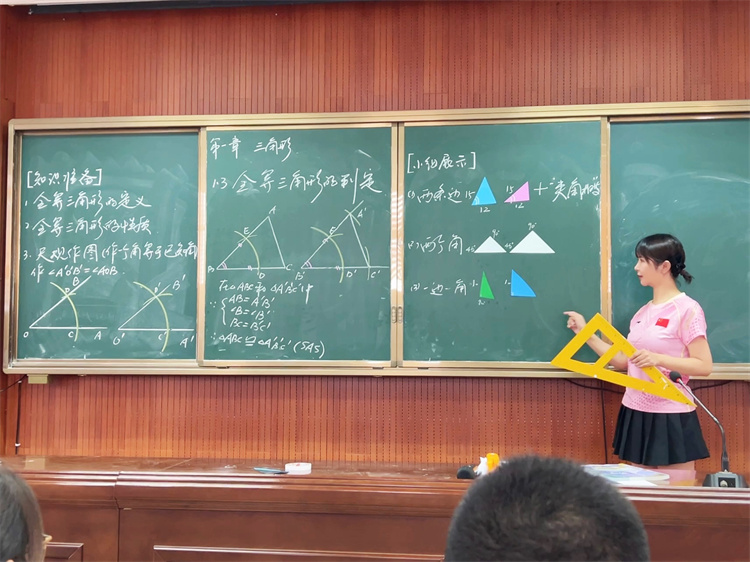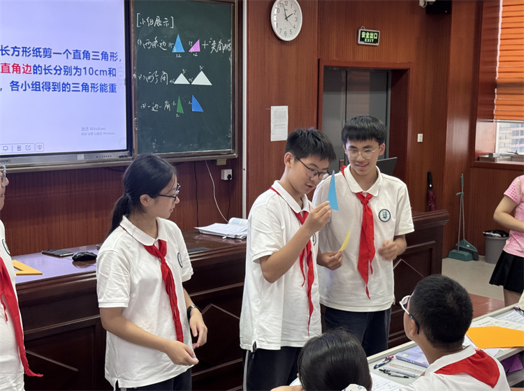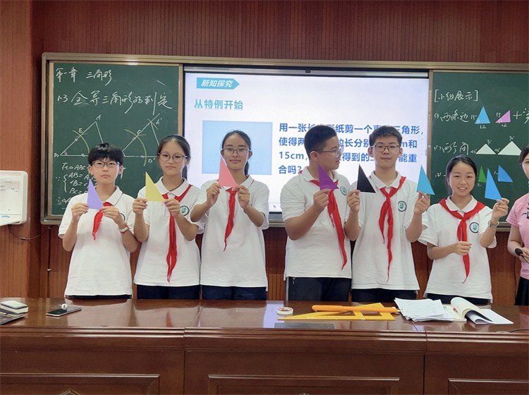 徐婕老师带领初二(10)班的同学一起探索了三角形全等的条件,指导同学们通过画图、测量、剪纸等实践活动,一步步得到三角形全等的判定条件——边角边(SAS)。课堂上,同学们思维活跃、大胆展示,课堂气氛轻松,师生活动融洽。