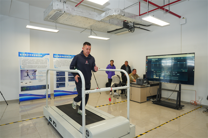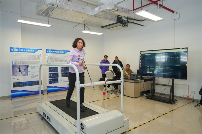 讲解结束后,参会人员纷纷投身体验环节。大家有序排队,在工作人员的指导下站上测试平台,亲身体验系统的评估流程。从踏上设备的瞬间,系统便开始实时采集数据,短短几分钟后,一份包含个人跑步问题分析、损伤风险提示与个性化训练建议的评估报告便生成出来。区党工委委员王恩春、中国航空研究院研究生院纪委书记兼副院长于彦泽等领导也参与其中,亲身体验科技为运动带来的精准指导。“原来我跑步时步幅过大,容易增加膝盖压力,这份报告给出的调整建议很实用。” 体验后,参会代表纷纷感慨道,现场氛围热烈,大家不时交流体验感受,对系统的专业性和实用性赞不绝口。