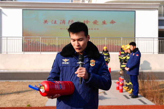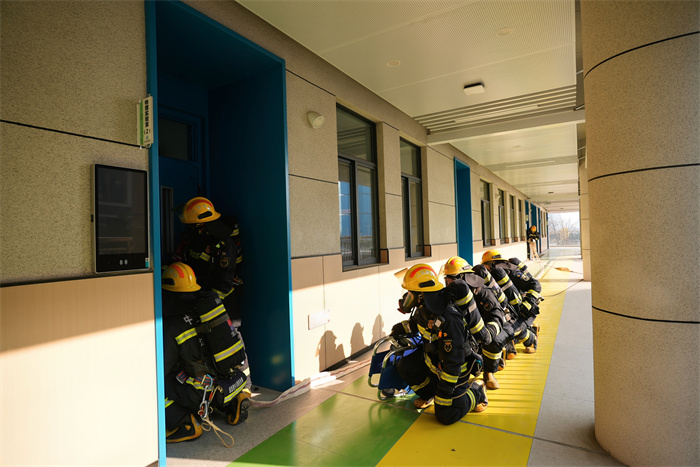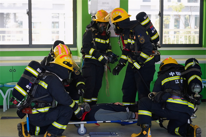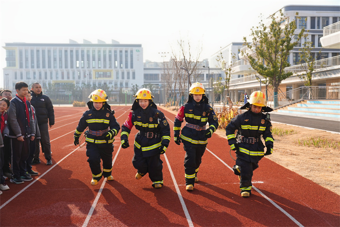 消防实操体验环节成为本次演练的亮点。消防官兵现场演示灭火器的正确使用方法,拆解操作步骤与注意事项;每班选派一名学生亲手参与灭火训练,其余学生在旁认真观摩、记录要点。随后的“消防员”体验环节中,每班一名学生穿上重达60余斤的消防服,切身感受消防员执行救援任务时的负重与艰辛。演练最后,消防官兵还组织开展消防救援实操,由学生扮演被困人员,模拟真实救援场景,让师生对消防救援流程有了更清晰的认知。