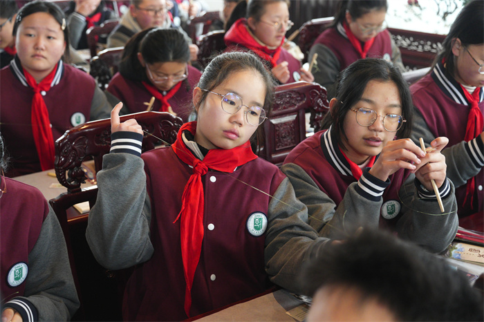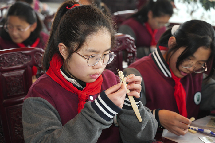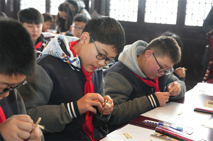 移步博物馆三楼,非遗传承人现场坐镇指导。每位同学都领到专属制作材料,沉浸式体验古法牙刷制作的全流程:选料、钻孔、栽毛、绑线,大家屏气凝神专注于每一道工序,在亲手实践中感受传统工艺的严谨与精妙,更在指尖劳作中建立起对本土非遗文化的认同感。