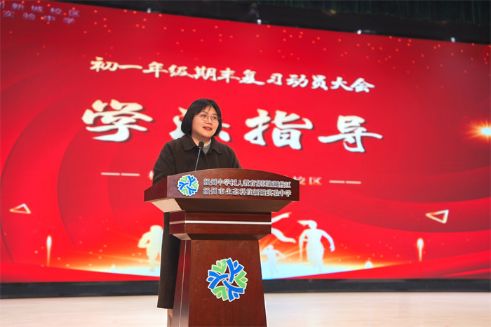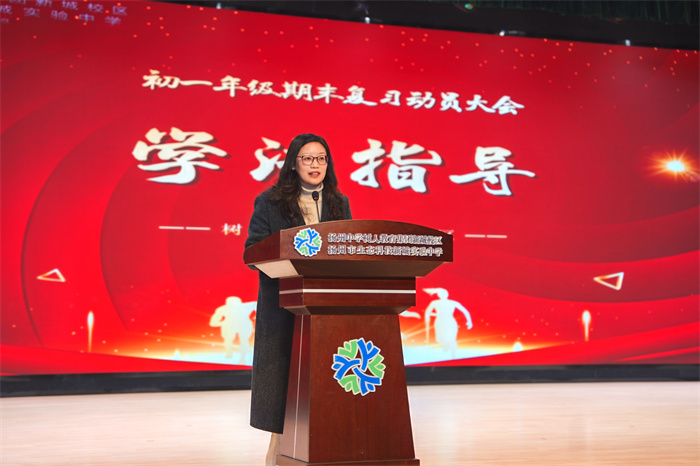 来自初一(4)班的张懿初同学和初一(1)班的许伟健同学作为学生代表上台分享备考心得。张懿初同学以《冲刺期末》为题,从复习巩固的具体方法入手,建议大家回归课堂笔记、重视错题本的反复研读、利用碎片时间朗读背诵,并根据薄弱点进行针对性练习。她鼓励同学们将期末考试视为一次成长的检验,把浮躁化为沉稳,把犹豫化为行动。