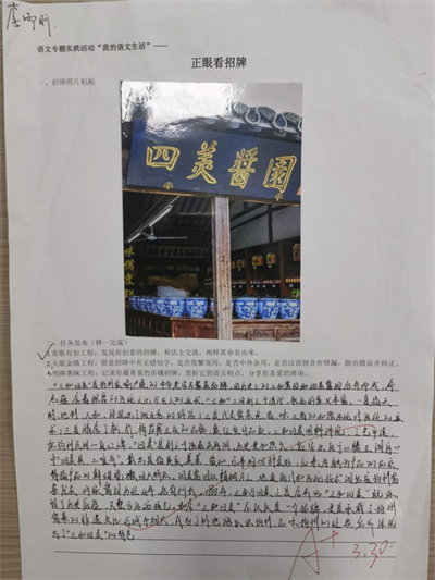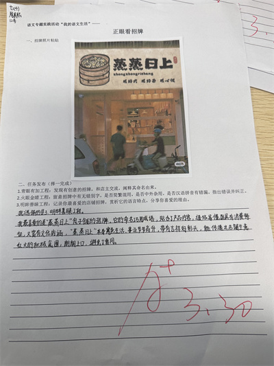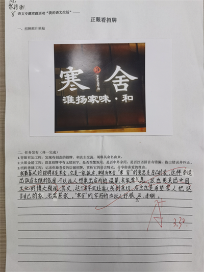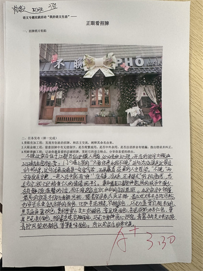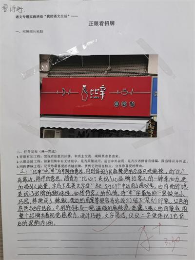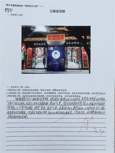 本次实践活动以“正眼看招牌”为核心,鼓励学生走出校园,走进城市街巷,观察各类店铺招牌。活动中,同学们热情高涨,主动参与,以小组为单位走上街头,认真观察,细致记录。在招牌拍摄环节,同学们充分发挥创意,精心选取拍摄角度,构图新颖,视角独特。有的聚焦古色古香的传统店铺,捕捉文字的典雅与文化底蕴;有的定格设计新潮、风格鲜明的现代门店,展现语言的创意表达;有的关注社区小店、便民商铺,发现平凡招牌中的生活气息与语言温度。一张张照片不仅记录了城市风貌,更体现了同学们敏锐的观察力与独特的审美视角,让语文学习变得生动而鲜活。
