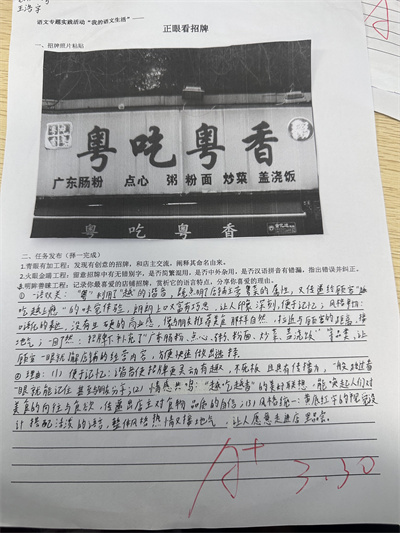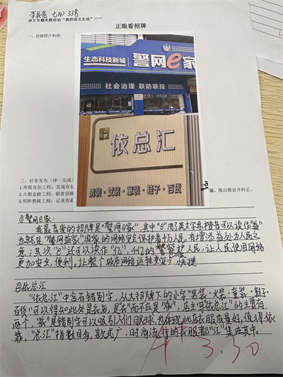 为引导学生走出课堂、走进生活,感受语文与现实世界的紧密联系,3月底,我校组织初一年级全体学生开展“我的语文生活——正眼看招牌”专题学习实践活动。同学们积极参与,热情投入,在街头观察、拍摄、探究与交流中,发现语言之美,规范用字习惯,提升综合素养,展现出浓厚的学习兴趣与良好的实践能力。