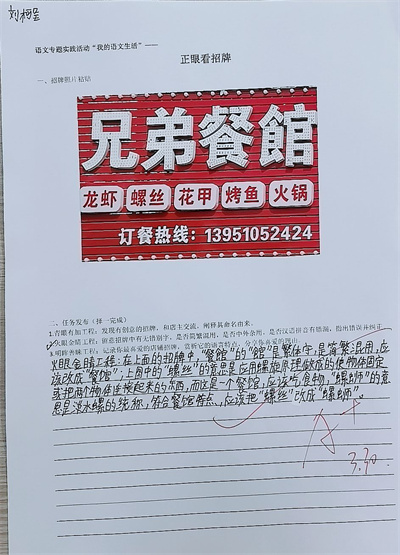 “火眼金睛工程”引导学生留意招牌中的用字规范,排查错别字、繁简混用、拼音错漏、中外文误用等问题,并尝试指出错误、提出纠正建议,强化语言规范意识。